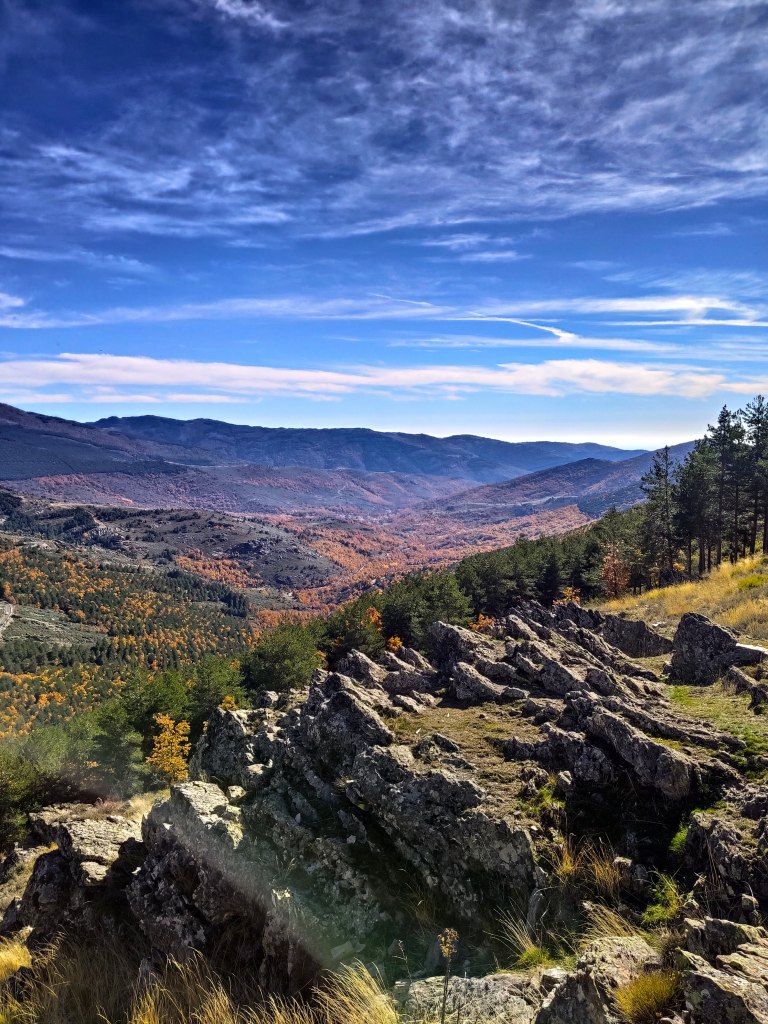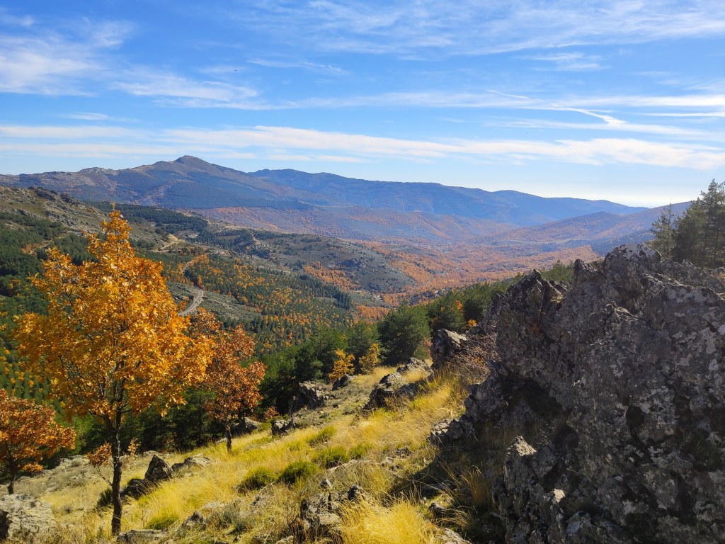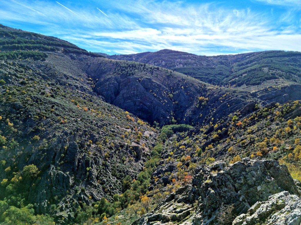 Una vez superado el primer repecho nos introducimos en lo más profundo de la sierra del Rincón, primero por un pinar y después por un precioso barranco con escarpadas paredes de pizarra y siempre con unas increíbles vistas serranas.