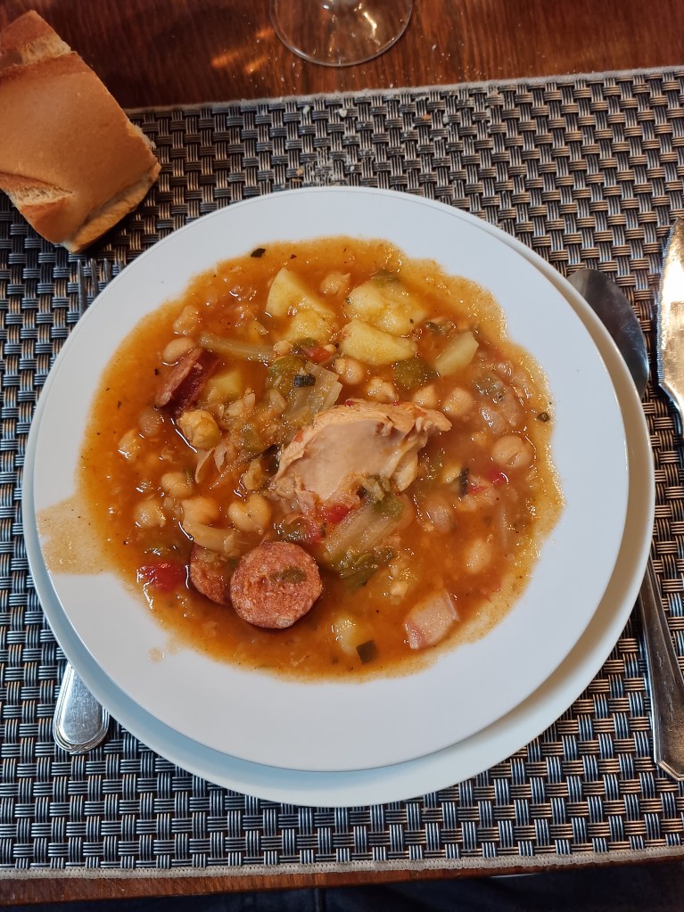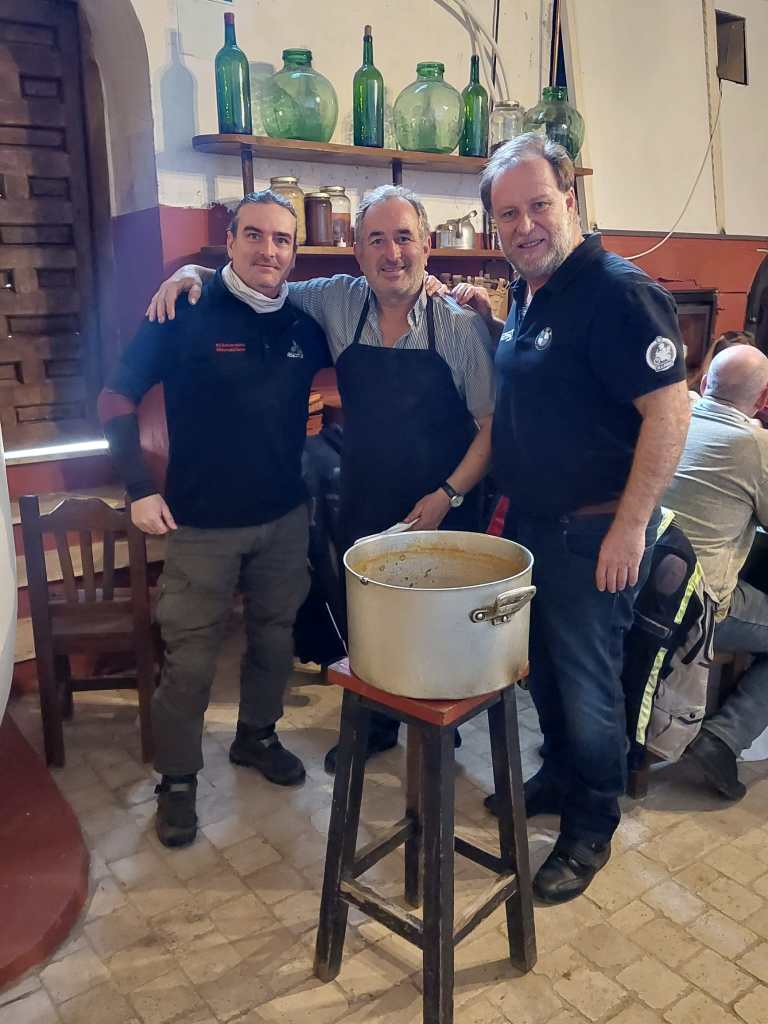 La comida la realizamos en una parte de la bodega adaptada para la restauración, donde comentamos detenidamente lo increíble que ha sido la visita al museo mientras llegan las diferentes viandas regadas por los vinos tinto y blanco de la propia bodega; siendo el plato estrella el llamado Cocido de los Segadores, que hace las delicias de los hambrientos moteros.