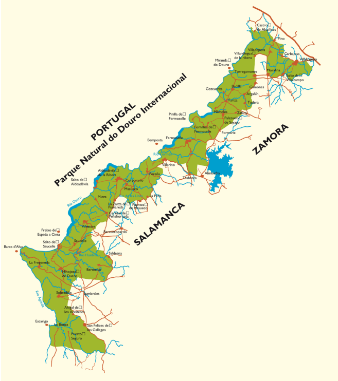 El Parque Natural Arribes del Duero se ubica al oeste de las provincias de Zamora y de Salamanca, mientras que en la parte portuguesa se encuentra el Parque Natural do Douro Internacional, estando integrados ambos parques naturales en la Reserva de la Biosfera Transfronteriza Meseta Ibérica.
