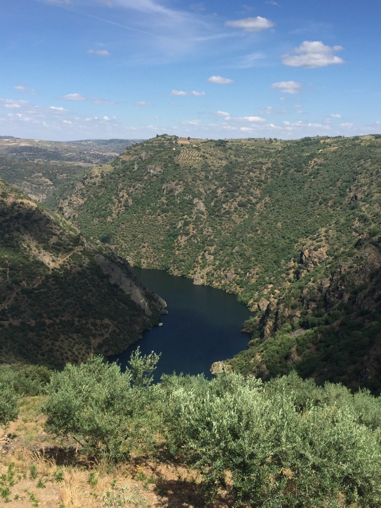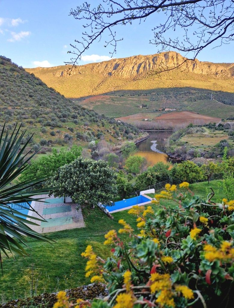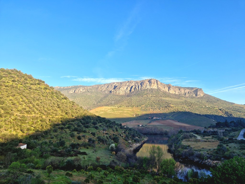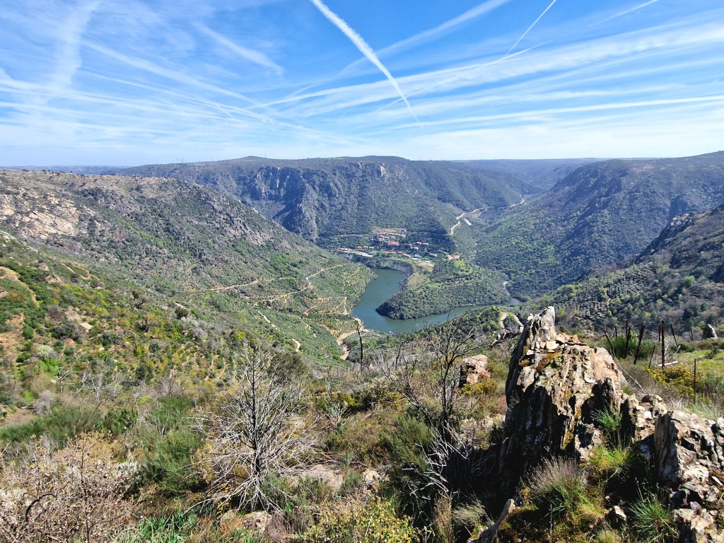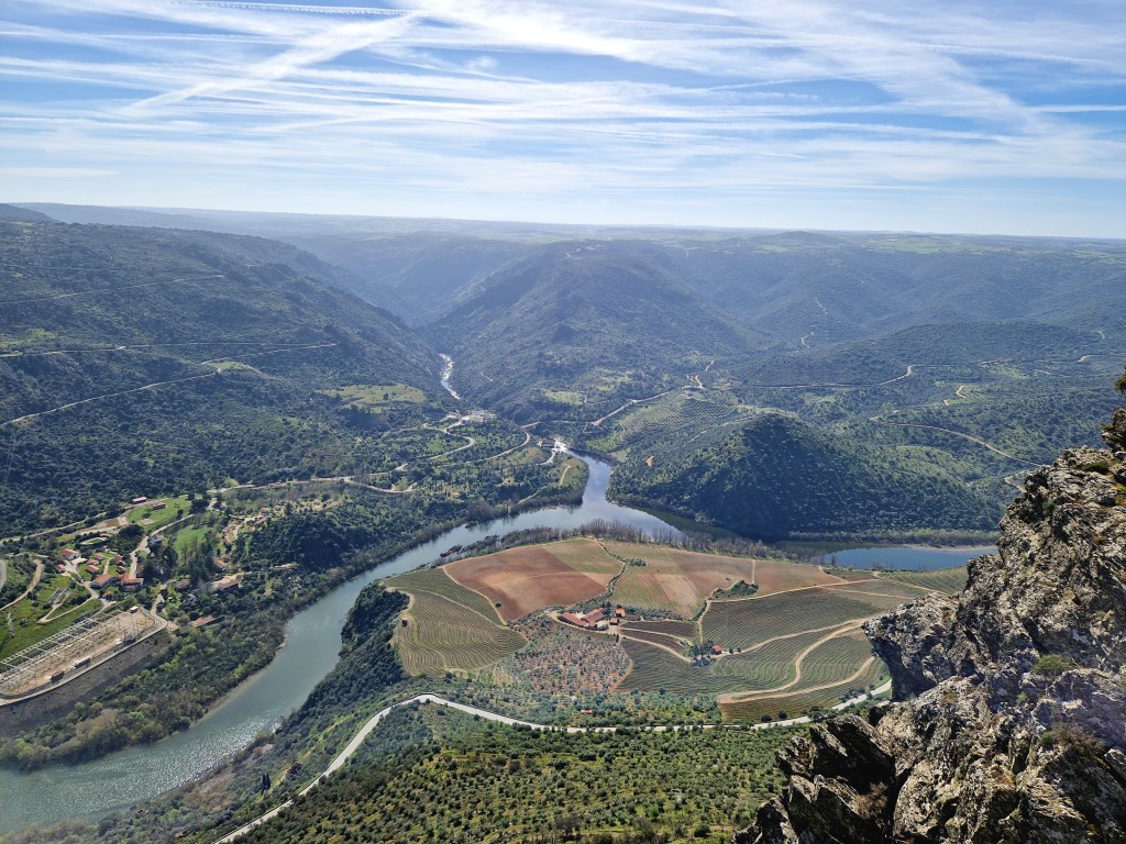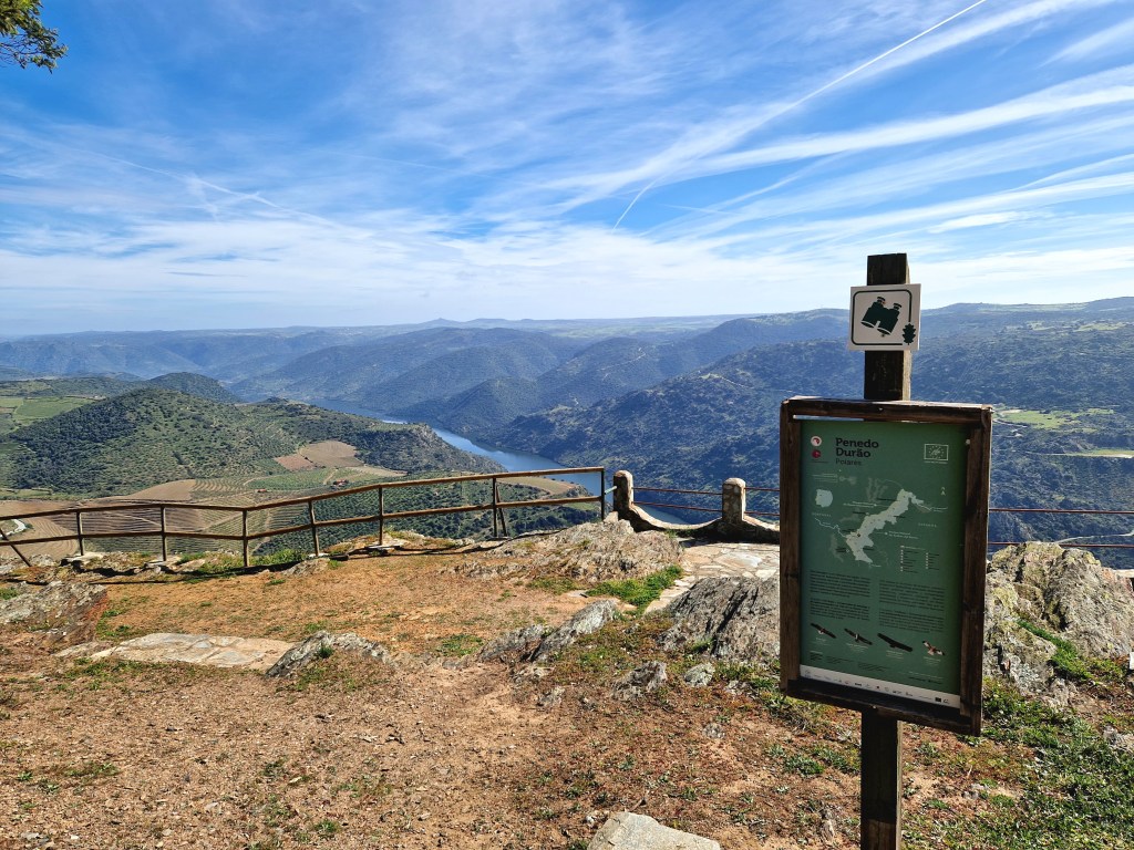Y precisamente ascenderemos a la cima de la rocosa montaña para detenernos en el mirador Penedo Durão, el más famoso del Parque Natural do Douro Internacional. Este mirador nos ofrece unas impresionantes vistas sobre el río Duero desde sus 550 metros de altitud, permitiéndonos vislumbrar el Salto de Saucelle y nuestro centro de operaciones, la Quinta de la Concepción.