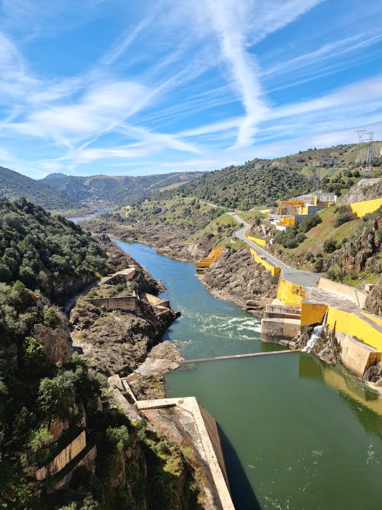 Tras recorrer ciento veinte kilómetros por carreteras lusas volvemos a España a través del Salto de Bemposta y su característica y chillona presa amarilla.