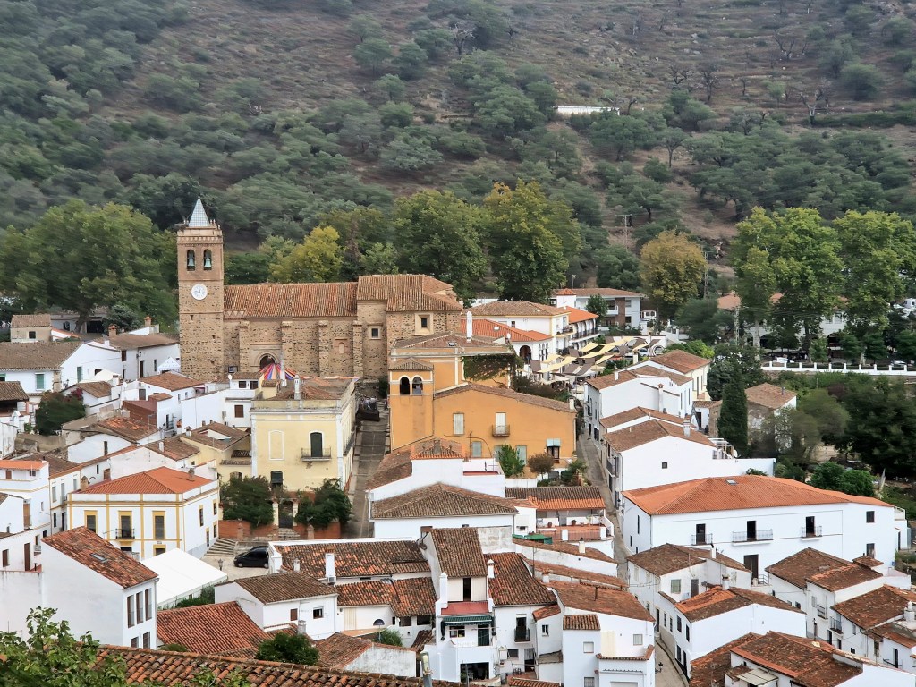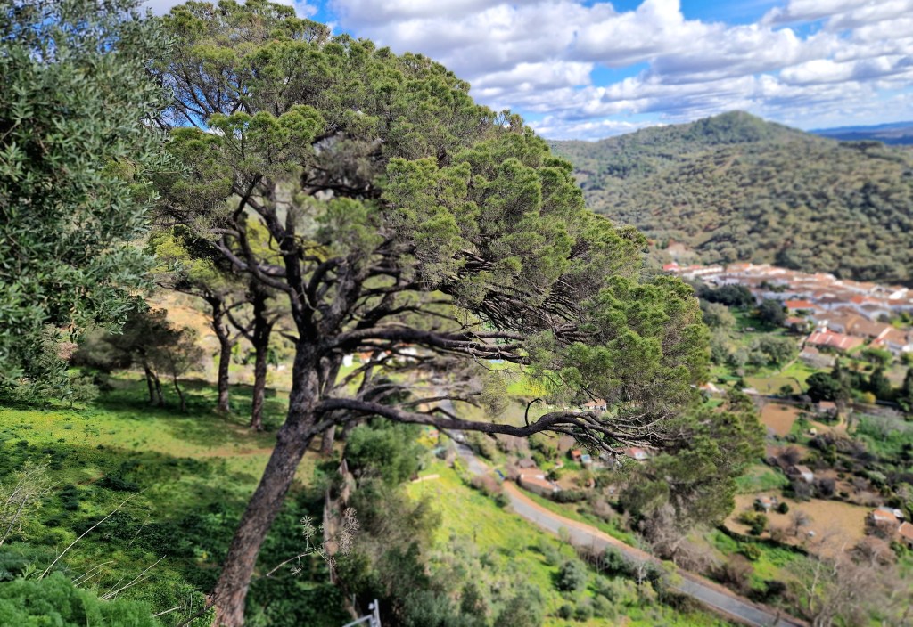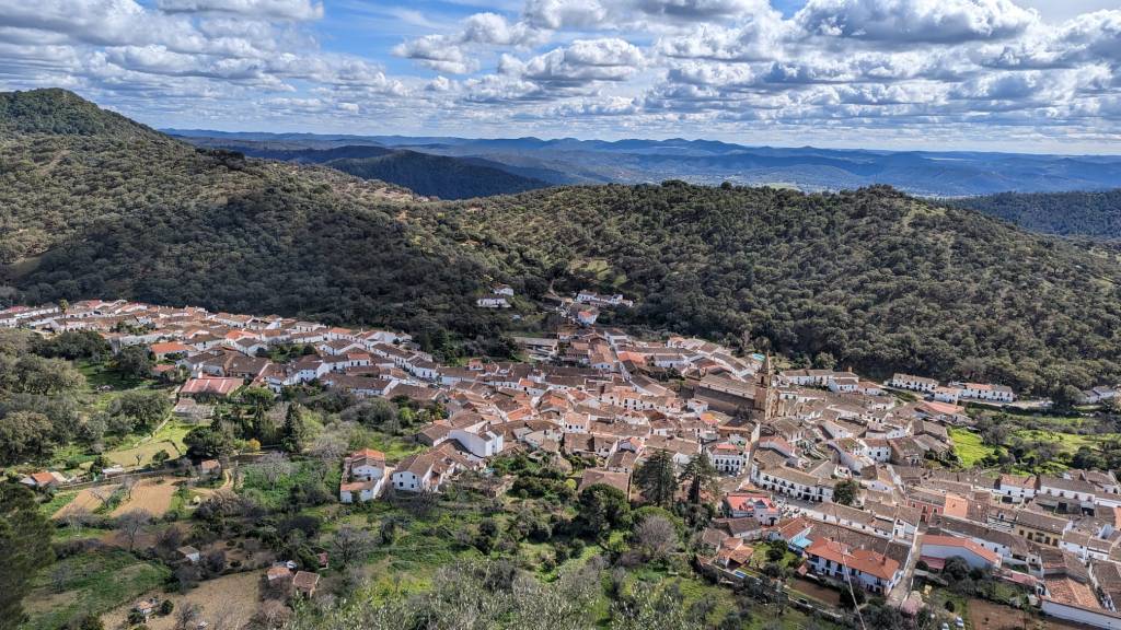Disfrutando de sus carreteras y paisajes entre alcornoques y castaños, llegamos a muy conocida Peña de Arias Montano, cuyo mirador nos ofrece unas magníficas vistas de la zona sur del parque natural y de la población de Alájar.